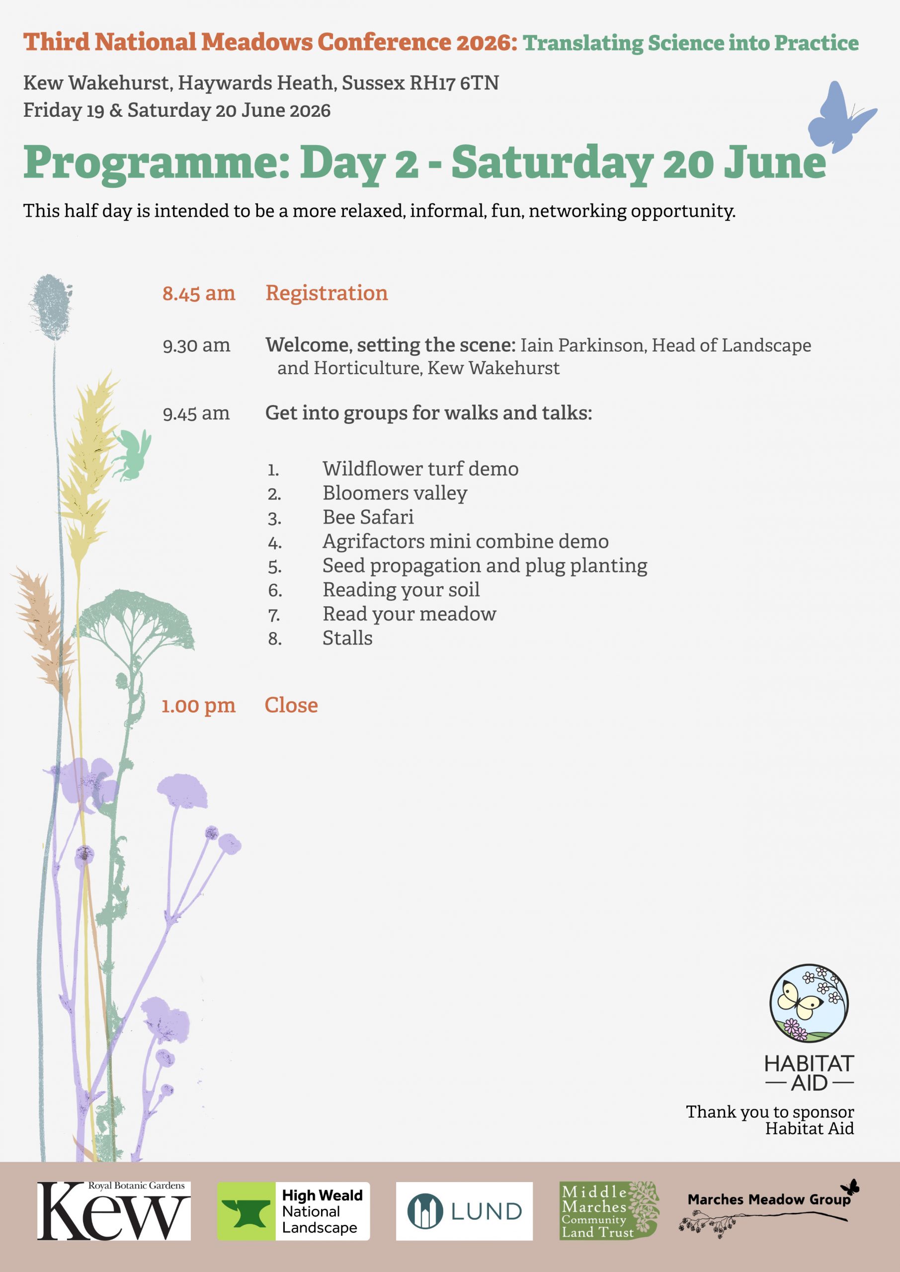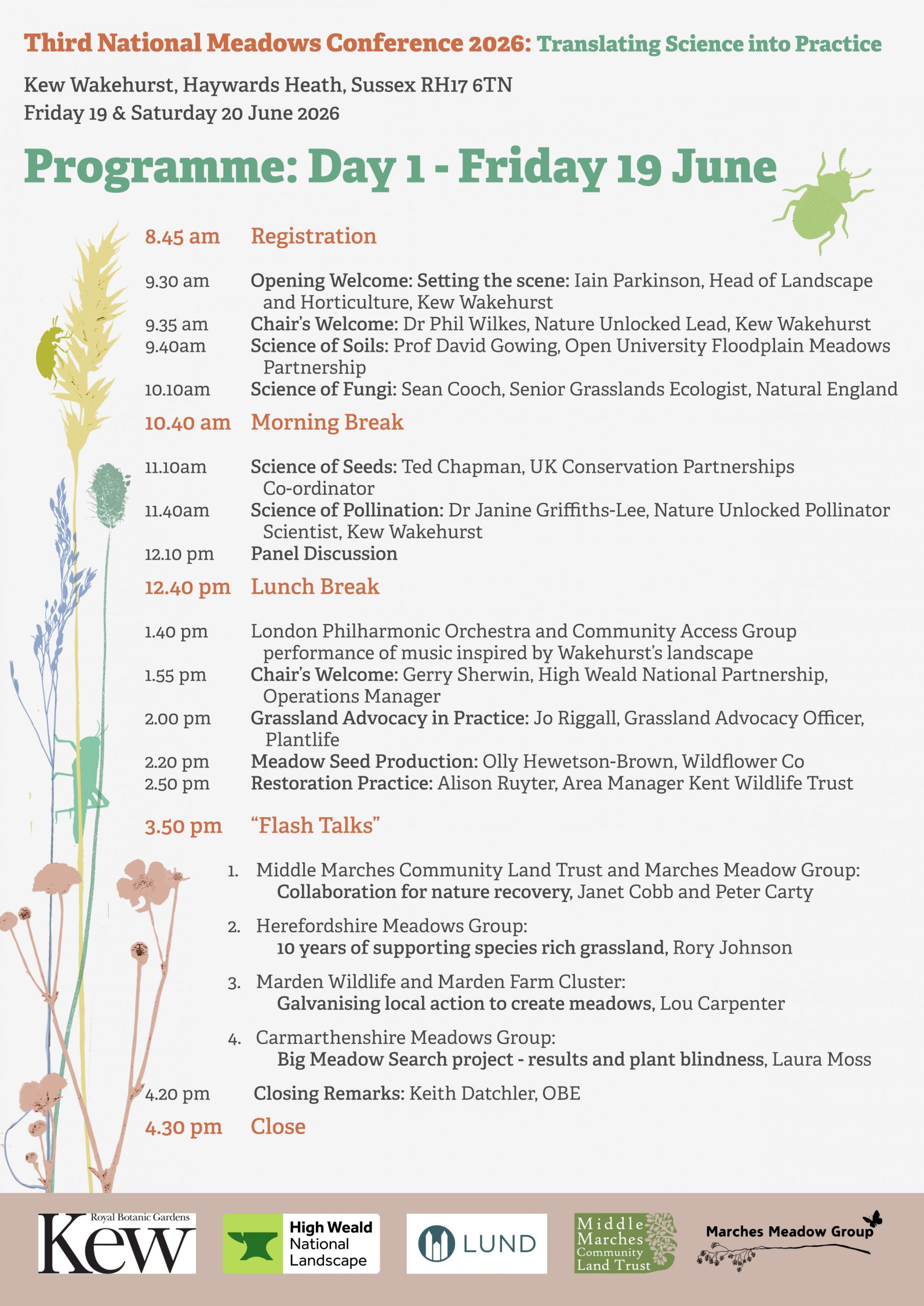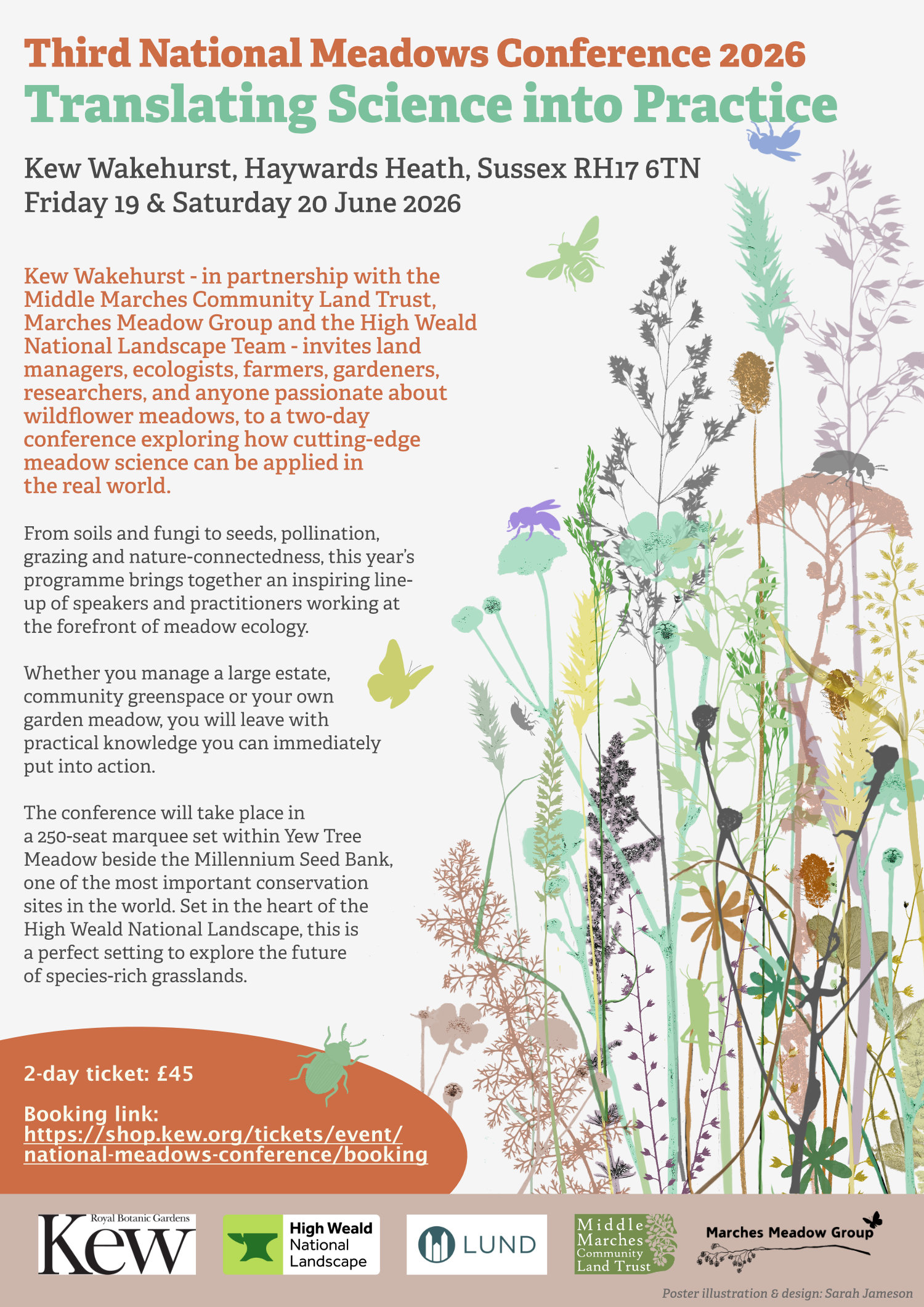 Kew Wakehurst – in partnership with the Middle Marches Community Land Trust, Marches Meadow Group and the High Weald National Landscape Team – invites land managers, ecologists, farmers, gardeners, researchers, and anyone passionate about wildflower meadows, to a two-day conference exploring how cutting-edge meadow science can be applied in the real world.