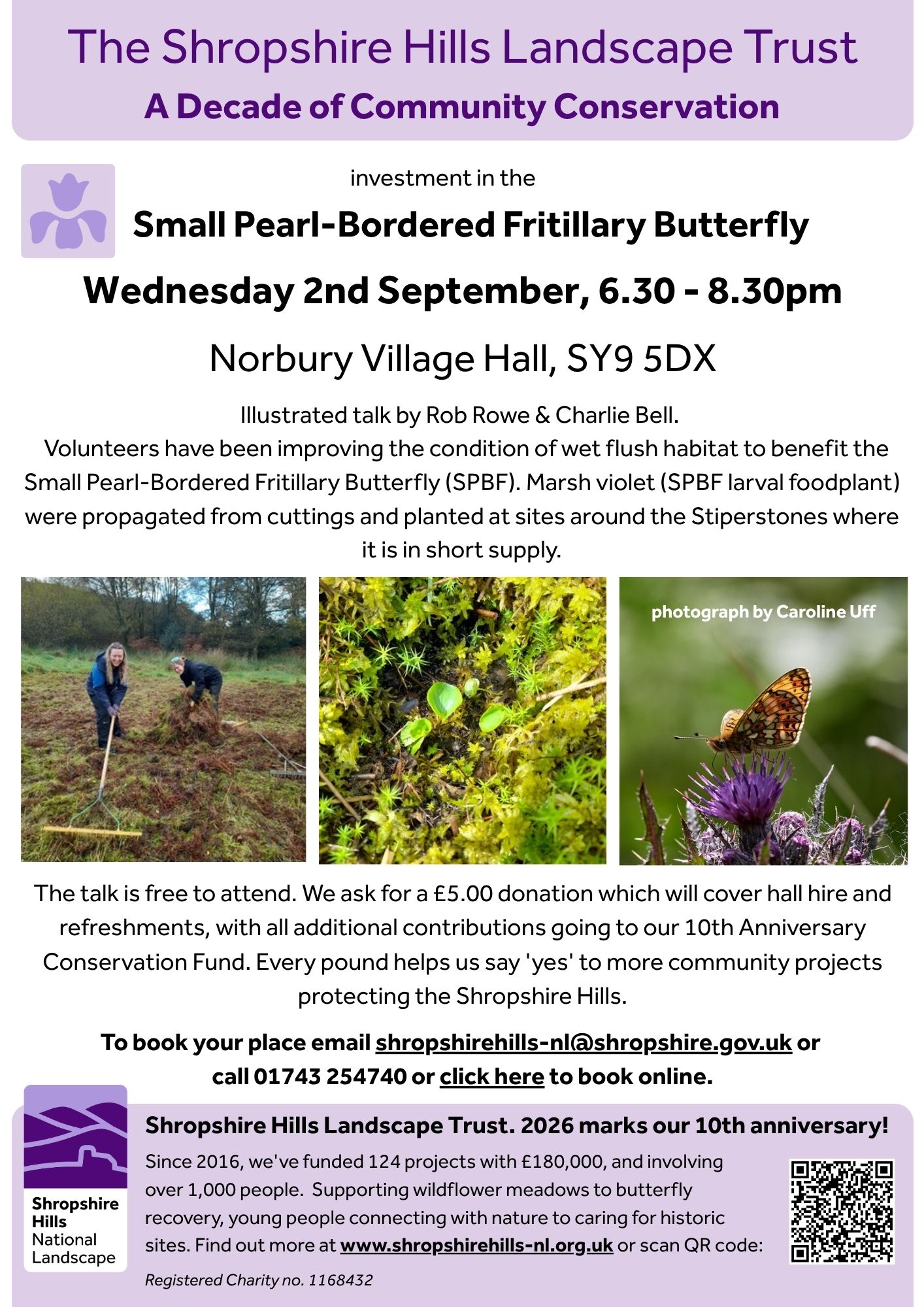 We ask for a £5.00 donation which will cover hall hire and refreshments, with all additional contributions going to our 10th Anniversary Conservation Fund. Every pound helps us say ‘yes’ to more community projects protecting the Shropshire Hills.